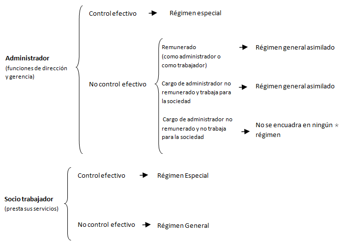 En el siguiente esquema podemos ver el régimen de la Seguridad Social que se le atribuye a los administradores y socios en función de poseer o no el control efectivo: